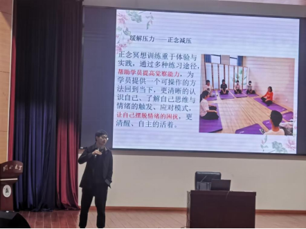 4月24日晚,黄东涛老师以“压力”为主题开展了第一次讲座,参会学生先做了一份压力测试问卷并抽奖,中奖者可获得黄东涛老师赠送的《少有人走的路》这本心理健康书籍。黄东涛老师分别讲述了什么是压力、常见的压力来源、影响压力的因素以及如何缓解压力这四个方面的内容,让学生认识到有压力是正常的,不必过分焦虑和担心,可以通过运动、正念吃饭或洗澡、培养宽阔的心胸等方式来缓解压力。