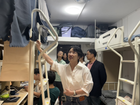 李岚书记走访了我院2022级部分本科生宿舍和2023级研究生宿舍。走访本科宿舍过程中,李岚书记与同学们进行亲切交谈,了解学生的返校过程及报到后的感受。李岚书记详细询问了我院回迁的2022级本科生对学校住宿条件、生活环境的适应情况,耐心倾听同学们对于住宿问题的反馈,积极与校后勤办协调沟通,并提出解决办法。