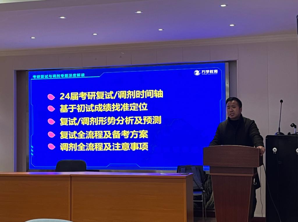 会上,杨老师分析了当前的考研形势和相关政策,解读了最新的研招复试政策,重点讲解了复试和调剂的具体内容,包括复试调剂流程的讲解、考研全国调剂渠道的讲解以及国家复试考核标准的解读等,为同学们提供了实用的备考策略。