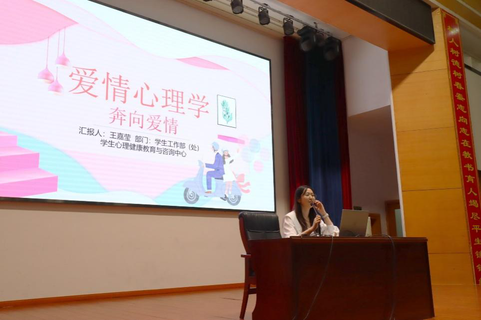 为深入贯彻落实党的二十大精神和习近平新时代中国特色社会主义思想,进一步加强、改进研究生心理健康教育工作,帮助研究生养成理性平和的健康心态,提高研究生心理健康意识,学院2024年5月15日在三号报告厅举办2023-2024学年第二学期研究生心理健康系列讲座。我院有幸邀请到学生工作部(处),学生心理健康教育与咨询中心的王嘉莹老师,作题为“爱情心理学”的专题讲座,目的在于通过深入分析爱情的心理学基础,帮助研究生更好地理解情感关系,提升心理健康水平。本次讲座我院全体硕博研究生和本科生心理委员参加。