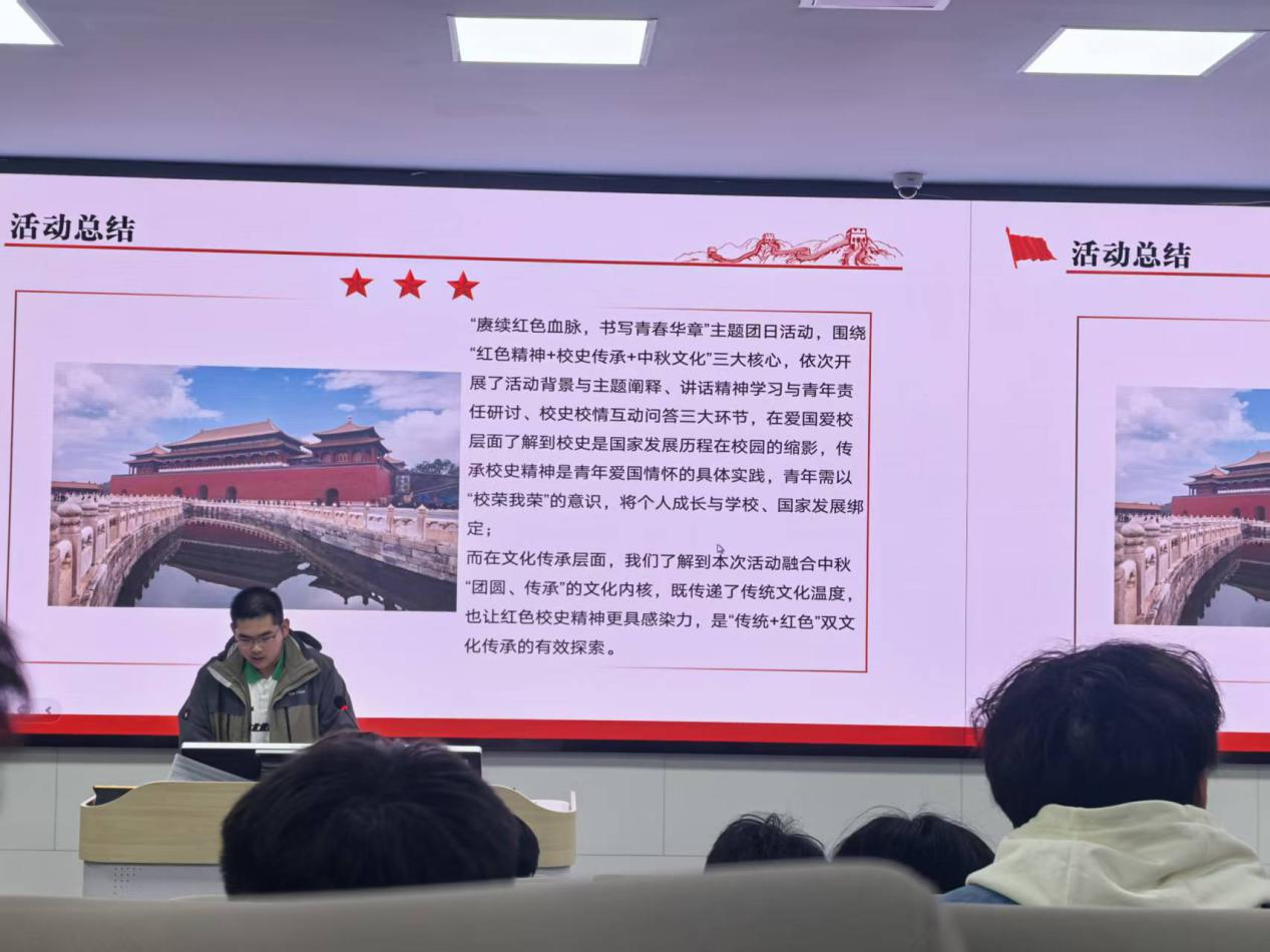 10月22日下午,环境工程(中外合作办学)2401班团支部开展了以“赓续红色血脉,书写青春华章”为主题的10月示范性主题团日活动,由班长赵张驰主持,围绕红色精神、校史传承、中秋文化三个方面展开。