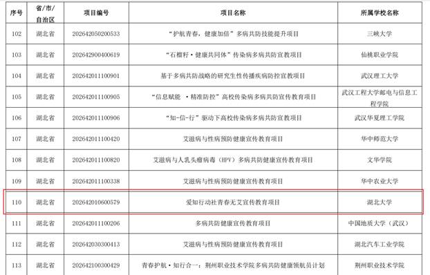 近日,中国性病艾滋病防治协会公布2026 年高校传染病多病共防宣教项目拟支持名单,由2138cc太阳集团爱知行动社联合校医院申报的 “爱知行动社青春无艾宣传教育项目”成功获批立项。