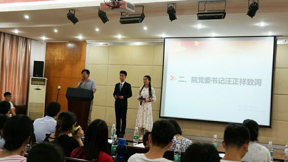 在奏响中华人民共和国国歌后,院党委书记汪正祥进行了一段精彩的致辞。他提到,近年来,学院高度重视学生党建,大力实施“党员导航工程”,搭建基层党建创新平台。该项目辐射面较广,参与度较高,在全院学生党员中形成了“向我看,跟我来,我有责任”的先进引领氛围。就如何做好学院学生党建工作,汪书记也提出以下几点想法:一是把握“两学一做”和习近平总书记关于高校党建与思想政治教育的重要讲话精神两个工作重点;二是凸显“党员导航工程”等学院特色品牌项目;三是强化示范引领,学生党员要充分发挥先锋模范作用,带头践行社会主义核心价值观,带头落实“四个合格”目标要求。
