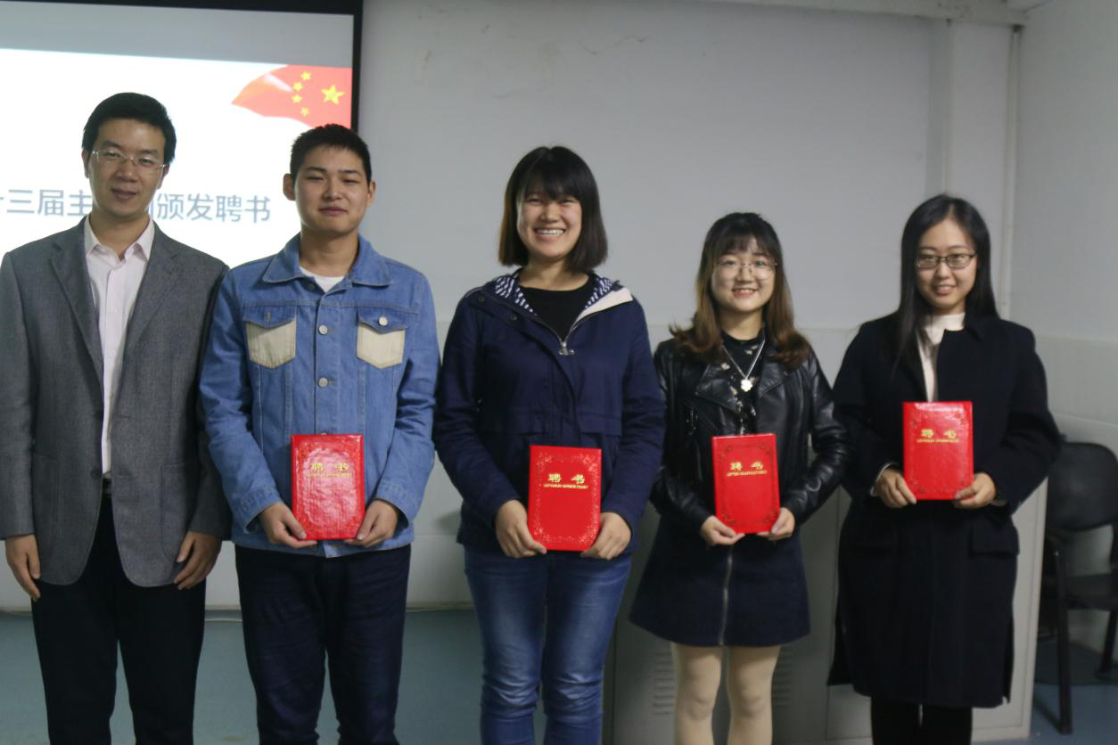 院团委书记王文锋老师宣读第十四届学生主席团任命书,之后,四位第十四届学生主席团代表:院青传副主编李清韵、院学生会副主席杨一伦、院社联主席聂梓源、院志协主席李红润先后发言。