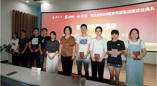 6月29日下午,在中地数码集团一楼学术报告厅举行了结业典礼,中地数码集团刘永总裁、刘季副总、李兆刚、方胡朝、杨金宇等人出席了典礼,我院于婧副院长、梅新老师、李中元老师带领15地信同学参加了结业典礼。