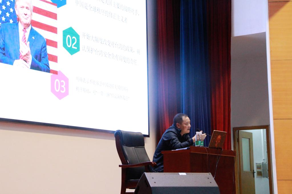 通识教育学院院党委副书记宋韧老师带领大家解读“中美贸易战”。宋老师紧扣时事热点,以美国挑起中美贸易战的背景,逐步分析美国特朗普政府的新政,运用一系列经济数据对比,指出了两国贸易战的实质性问题,并通过举例的方式介绍了美国历来的对外经济政策。最后宋老师指出,我们应用正确的心态去应对中美贸易战,中美关系需要重新平衡。