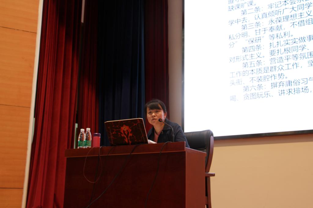 首先由教育学院院党委副书记余燕老师主讲,以“新时代青年大学生的历史使命与责任担当”为主题。余燕老师分享了习近平总书记“中国青年说”的七句话,同时联系当代杰出大学生的事迹,向同学们介绍了宋玺、刘薇、刘明侦等同学的故事,进一步点明了新时代大学生的使命与责任。紧接着余老师以近期某些高校学生会、社团的官僚习气为反例,号召全体学生要有新时代学生应有的情怀与担当。最后余老师以“朝霞般美好的理想,正在向你们召唤,你们是一滴一滴的水,全将活跃在祖国的大海里!”作为结语,表达了对同学们的殷切希望。