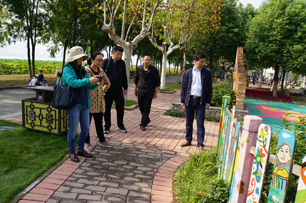 图为李原原主任一行参观沙湖公园梦想花园——一座孩子们设计的废弃物再利用环保主题花园