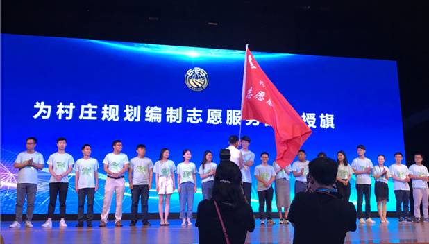 在开幕式各领导致辞之后,启动了村庄规划编制志愿者服务活动启动仪式,村庄规划编制志愿服务活动以服务村庄规划编制为主要内容,组织省内高校、国土空间规划设计和科研单位,成立志愿团队,赴对口村庄,深入开展知识宣传、基础调查、规划编制工作,提升村庄规划水平。我院联合商学院、政法学院学生共同组成了志愿者服务团队,在启动仪式上,我院研究生郑粮作为代表上台参与了授旗仪式。