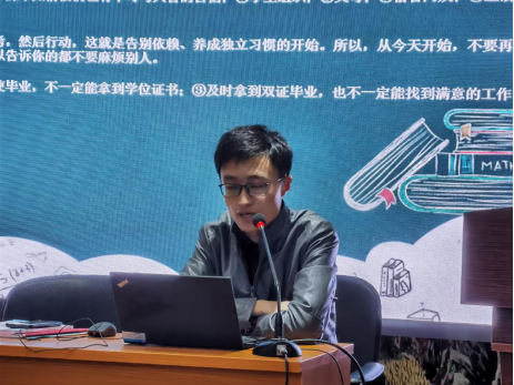 10月16日下午,学院辅导员李彦伯老师进行新生入学教育第二讲,讲座题目为《青葱岁月,携手同行》。李彦伯老师详细介绍了我校校纪校规中跟新生学习、生活最紧密相关的内容,并就大学生应征入伍、学生重要证件办理、大学生基本医疗保险报销、户口转入、教务查询等常见问题为大家做了一一说明。李彦伯老师寄语新生要积极适应大学生活,主动尝试各种机会,在适应和尝试中发现大学生活的美好。