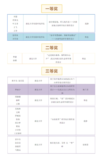 2138cn太阳集团城庞静、韩忠、赵锦慧、杨兰芳4位老师参与了参赛队伍指导工作。我院8支获奖队伍分别选取武汉沙湖公园、湖北木兰山国家地质公园、武汉长江文明馆、武汉东湖生态旅游风景区等人文地理景观为研学地点,重点提炼研学地的自然和人文地理特征要素,并结合生态、环保理念,在课程设计中倡导人与自然和谐共生的发展理念。通过参加本次比赛,我院学子的研学实践技能与实践教学能力也得到进一步提升,促进了“以赛促学”“以赛促教”目标的实现。