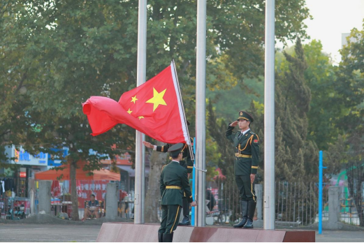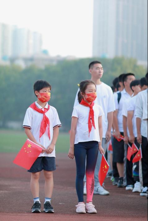 早上7:00,升旗仪式正式开始。国旗护卫队迈着矫健的步伐,护送国旗到升旗台,全体人员面向国旗肃立行注目礼。在雄壮的国歌声中,迎着第一缕晨光,五星红旗冉冉升起,迎风招展。