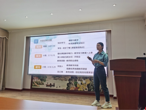 图为王雪怡同学在进行实习总结汇报