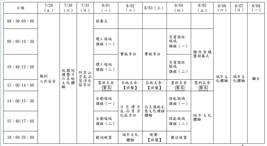为了推动海峡两岸环境领域师生交流,增进友谊和了解,云林科技大学环境与安全卫生工程系将举办2016年环安卫暨绿色科技暑期研习营活动。活动时间:2016年7月29日至8月8日。活动期间的食、宿、交通、考察及保险费用由主办单位承担(文化体验活动的餐费、活动费、交通费及住宿费自理,考虑到与会人员的安全性,文化体验活动将由主办单位同意代订旅馆),往返旅费自理。