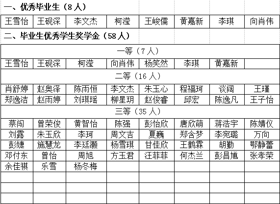 资环学院2023届优秀毕业生和毕业生奖学金评审结果公示 根据《关于组织开展2023届毕业生优秀学生奖学金、先进荣誉称号评定工作的通知》,经个人申报、学院评审,现将资环学院2023届优秀毕业生和毕业生奖学金评审结果公示如下: 公示时间:2023年3月27日——3月29日,公示期间如有异议,请至学院201办公室反映。 2138cn太阳集团城学生工作办公室 2023年3月27日