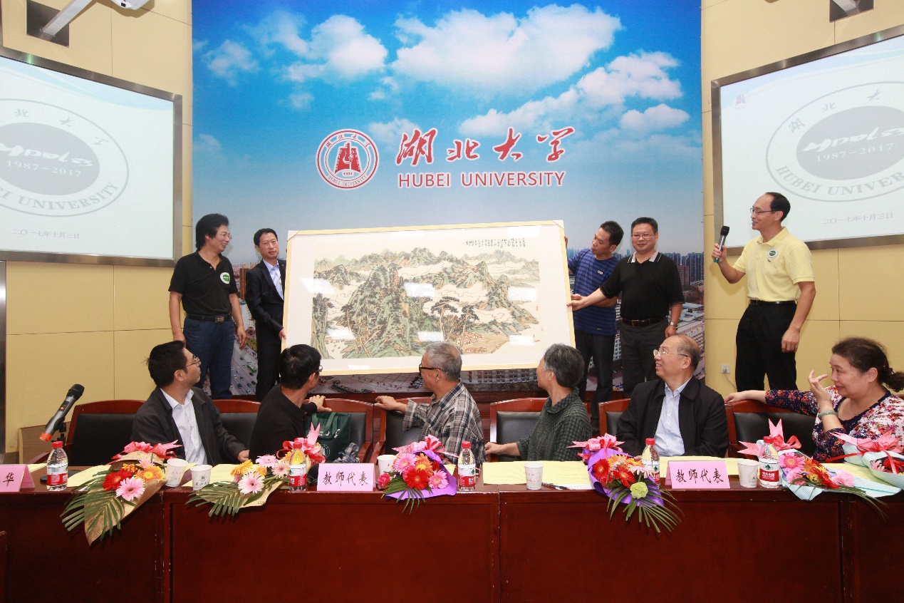 随后,校友代表们还将大家精心准备的礼物以及鲜花赠予当年的各位老师,铭谢师恩。在师生自由发言的环节,校友们纷纷回忆分享往昔求学与实习期间的趣事,共同回顾了在校学习和生活的点点滴滴,互相交流了自己目前的发展情况,表达了对母校、对昔日班集体的深厚感情,还通过写诗作词的方式表达了对老师的感谢之情。校友代表陈迪和还将自己精心创作的画作赠予学院,寓意“山常青,水长流,人常在,情常驻”,表达了对全体地理系83级校友们的美好祝愿。
