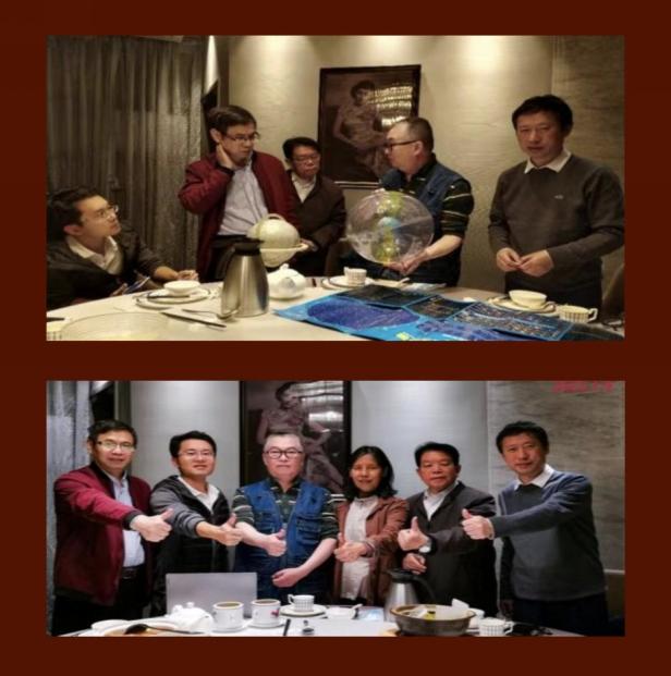 图为刘华新校友(右一)与同事一起商讨天球仪设计方案
