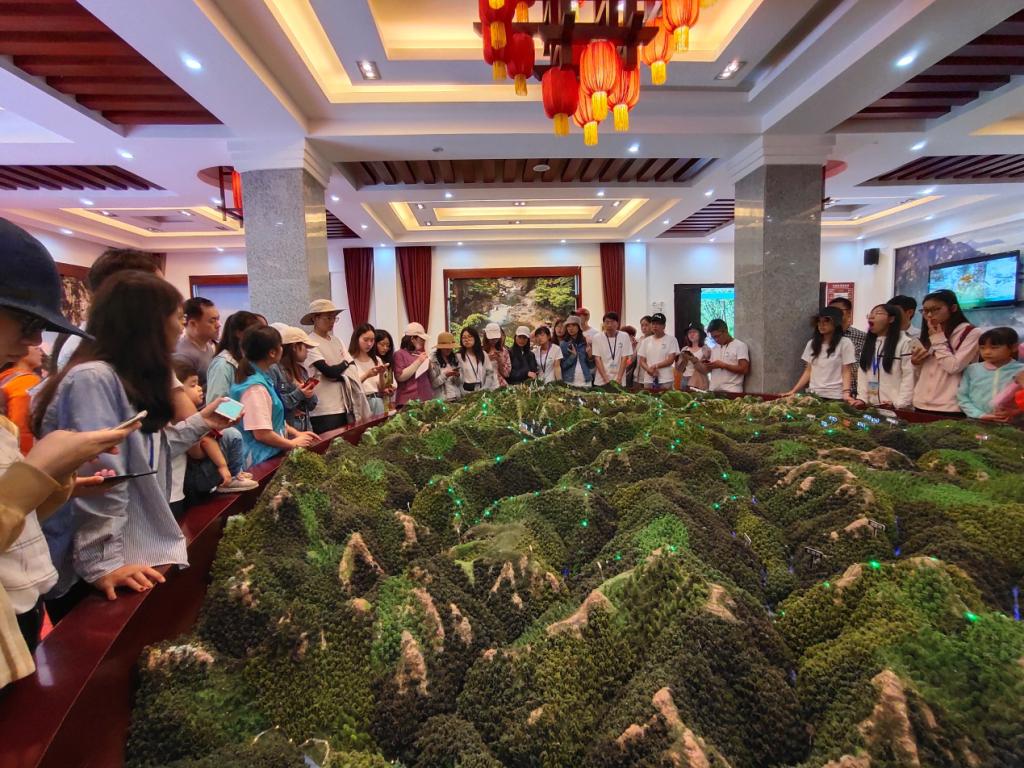 随后来到被誉为“华中第一峰”、海拔3106.2米的神农顶。由于当天天气不佳,能见度极低,师生们无法一览神农顶风采以及山顶的高山草甸景观,便坐车前往金猴岭。在金猴岭参观了大片的由秦岭冷杉和红桦组成的原始森林,见识了北亚热带区域典型的植被类型—常绿落叶阔叶混交林的特征,以及丰富的生物多样性。随后,实习队伍前往官门山景区,先后参观了“地质馆”、“地貌馆”、“熊猫馆”等多个展馆。途中,湖北科技学院朱俊成老师及各展馆讲解人员为大家讲解神农架的旅游发展与生态保护、地质、地貌等概况。