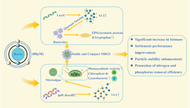 微藻-细菌颗粒污泥(MBGS)是一种高效、节能且环境友好的污水处理技术,能够通过微藻和细菌的协同作用实现污染物去除和资源化利用。然而,藻类与细菌之间的相互关系易受环境变化影响,导致系统稳定性下降。本研究聚焦硼元素在MBGS系统中的作用,发现硼通过促进细菌自诱导因子(AI-2)的分泌,激活群体感应(QS),显著提高细胞外聚合物(EPS)的生成量,增强了颗粒污泥的结构稳定性和沉降性能。同时,硼调控藻类吲哚-3-乙酸(IAA)的水平,提高光合作用效率,使绿藻门和蓝藻门的丰度显著增加,从而优化了氮、磷等污染物的去除效率。在最优硼浓度(80 µM)下,MBGS系统表现出最佳性能,包括显著提高的氨氮(NH4+-N)和磷酸盐(PO43--P)去除效率,以及降低的氧化应激水平(以超氧化物歧化酶(SOD)活性减少为标志)。硼通过调控藻类与细菌的信号通信,强化了它们的协同作用,为提升MBGS技术在污水处理中的稳定性和效率提供了理论依据。这一研究结果展现了MBGS技术在实现碳中和与资源回收方面的巨大潜力。本论文2138cc太阳集团为第一完成单位,2138cn太阳集团城2021级硕士生万仁辉和2023级硕士生莫凡为共同第一作者,2138cn太阳集团城胡惠秩副教授为论文通讯作者。该项研究得到湖北省自然科学基金的支持。