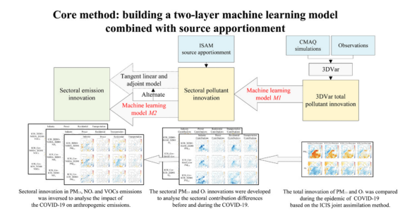 排放源的不确定性一直是空气质量模型模拟误差的主要来源之一。特别是在像COVID-19这样的重大公共卫生事件期间,人类活动的急剧变化对空气质量产生了显著影响。为了更准确地评估这些影响,需要发展高精度、高时空分辨率的且区分行业来源的排放源反演方法。本研究中,2138cn太阳集团城黄丛吾讲师及其团队开发了一种结合三维变分和机器学习的行业排放源反演方法。该方法利用多尺度空气质量模型CMAQ,结合污染物来源解析技术ISAM,实现了对新冠疫情前后京津冀地区PM2.5和O3浓度的精确模拟和排放源反演,分析了新冠疫情对不同行业排放源及其对污染贡献的影响。