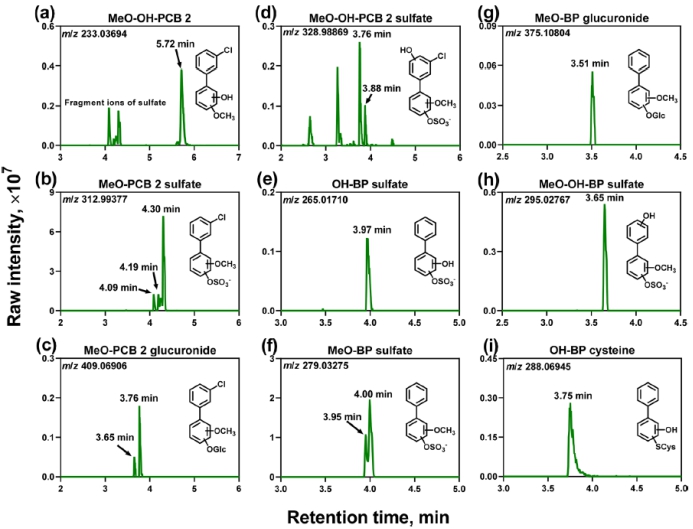 多氯联苯(PCBs)是一类人为合成的持久性有机污染物(POPs)。由于环境管理政策的滞后,在上世纪20年代末期至90年代初期,全世界范围内以商品化PCBs混合物形式共生产PCBs约130万吨,主要应用于电容器和变压器的介质,并最终随废物处理被部分释放到环境中。以PCBs本身作为工业产品的大规模生产已禁止将近半个世纪(比如:我国在1974年禁止了PCBs的生产),但其环境影响仍然存在,且PCBs作为工业副产物仍在持续产生(如:钢筋、混凝土的生产会产生PCBs副产物),这也导致PCBs在环境介质与人体内至今仍被普遍存在。比如,我国主要城市空气以及主要河流水体中PCBs的含量仍大部分超过相关的限量规定,且在我国多个地区人体血清样品中PCBs的检出率仍较高(几乎为100 %)。然而,PCBs暴露会引起人体包括癌症、神经毒性、内分泌干扰等多种不利的健康影响,尤其PCBs已被国际癌症研究组织(IARC)明确列为对人体有致癌作用的1类致癌物质。PCBs的毒性不仅与其本身有关,还与其毒性代谢产物在体内形成与积累有关,且毒性代谢产物的形成通常是毒性终点或疾病发生早期的关键过程之一。因此,PCBs在体内的代谢转化是其毒理与健康效应研究的重要课题。