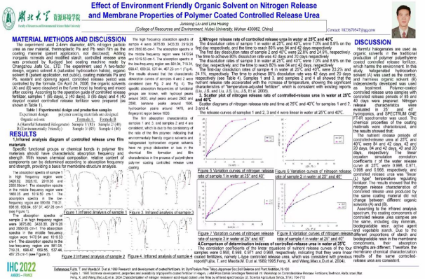 8月14-20日,2022年国际园艺学大会(IHC2022)在法国里昂隆重举行。我院刘俊松教授作为国际园艺学会会员和有机热带和亚热带果树学会主席(Chair of ISHS Working Group Organic Tropical and Subtropical Fruits)应邀参加15日和16日线上会议,他提交的两篇学术论文【Effect of Environment Friendly Organic Solvent on Nitrogen Release and Membrane Properties of Polymer Coated Controlled Release Urea】和【Preparation and Efficacy of Plant-Derived Insecticides and Herbicides】,分别以Poster和E-Vidio形式参加交流,其中,【Effect of Environment Friendly Organic Solvent on Nitrogen Release and Membrane Properties of Polymer Coated Controlled Release Urea】入选优秀论文候选名单,是唯一来自中国的学术论文。