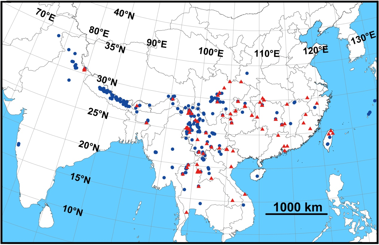 地图:拟遁蛛属的分布(蓝色园点为已知种,红色三角形为新种)