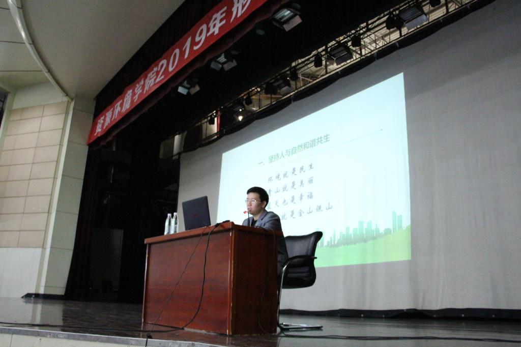 李明老师讲授的主题是《习近平生态文明思想与中国生态文明建设发展之路》。他从坚持人与自然和谐共生、树立和践行绿水青山就是金山银山理念、推动形成绿色发展方式和生活方式、统筹山水林田湖草系统治理、实行最严格生态环境保护制度等角度详细讲述了习近平总书记对生态文明建设提出的要求,并鼓励同学们学好本专业知识,为国家的生态文明建设贡献自己的一份力量。