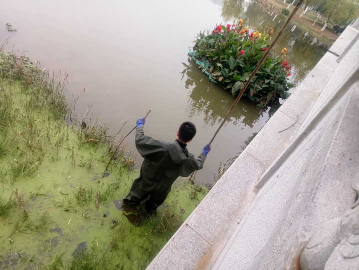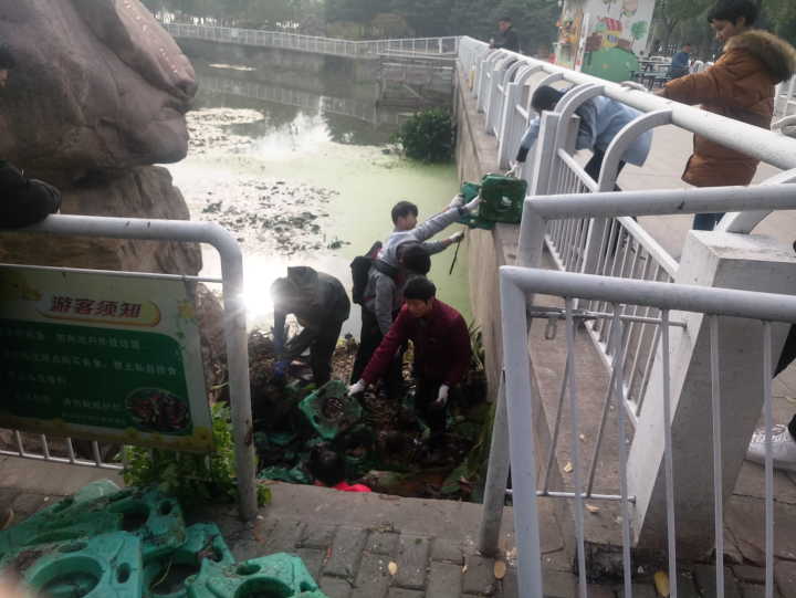 下午两点,活动伊始。此次活动分为鱼乐园捞浮岛与雁桥剪绿植两部分。在鱼乐园环节中,志愿者们就地取材,从公园里找到几支竹竿,长一短二,调整单个小浮岛的位置。志愿者高铭哲自愿下水,拉拽分离浮岛,两相配合,效果明显。到了雁桥,由于浮岛位置不够好,割除绿植无法完全,只割除了大半。