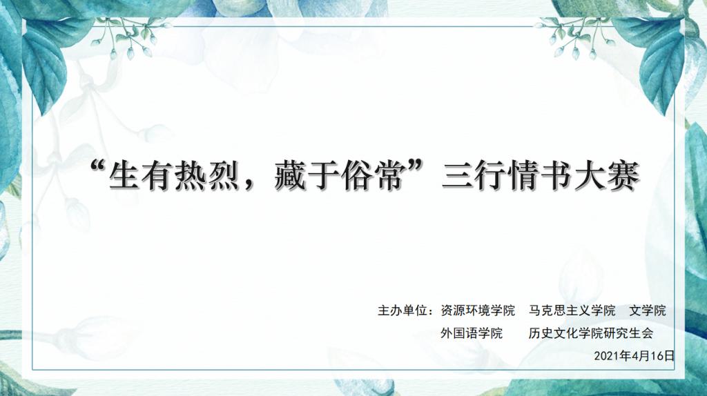 2021年4月16日晚上7点,“生有热烈,藏于俗藏”三行情书大赛决赛在文学院B6016顺利举行。本次大赛由2138cn太阳集团城、马克思主义学院、文学院、外国语学院、历史文化学院5个学院共同举办。初赛大约有120人参加,最终每个学院5人进入决赛,共25人。决赛由2138cn太阳集团城2020级研究生马营主持。