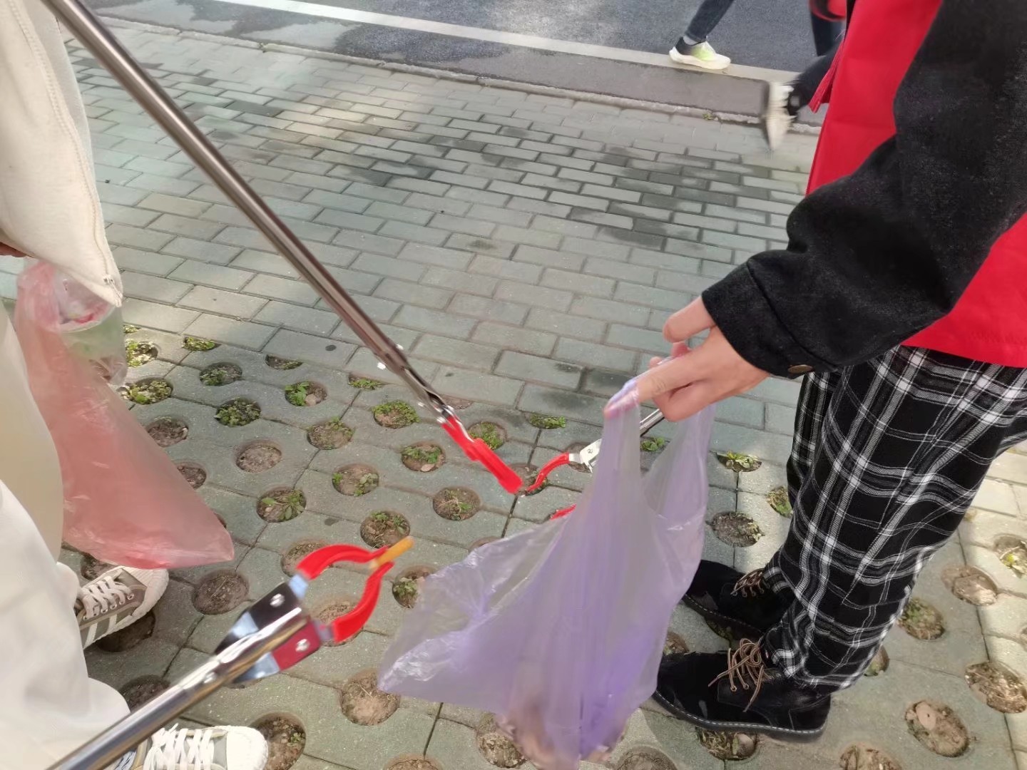 活动开始前,此次活动的两位负责人将活动志愿者三人一组分为六组,在给每位志愿者分发清理工具时,除了夹子以外,还给每组分发了三种不同颜色的垃圾袋,呼吁志愿者们将垃圾分类处理。上午九点,两位负责人各自带领三组志愿者,从2138cn太阳集团城一楼出发,按照规划路线展开清洁。