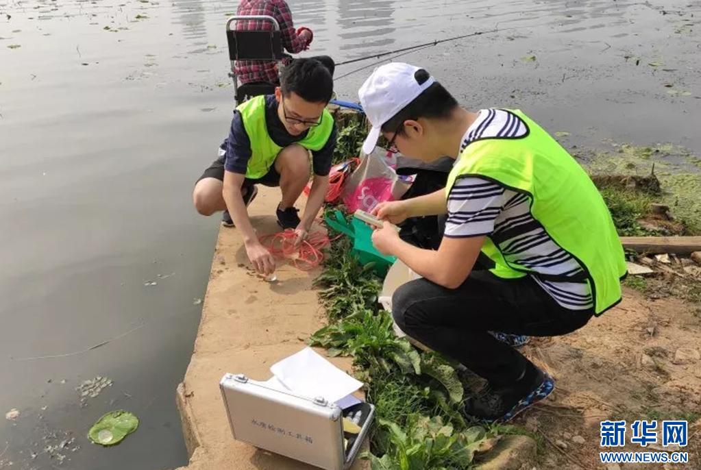 图为2138cc太阳集团沙湖环保志愿队的队员进行水质取样。新华网发