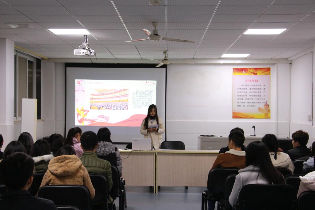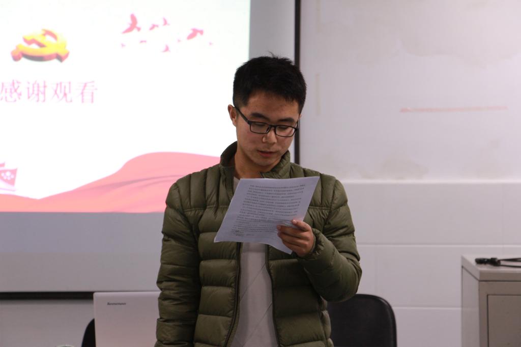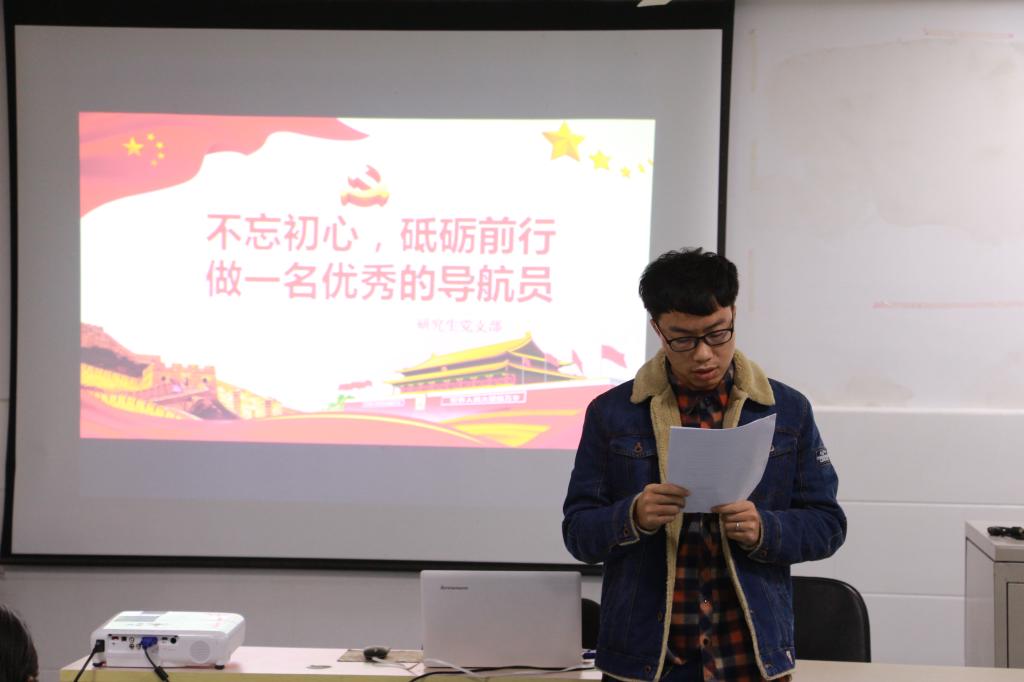 城规党支部发展对象代表舒服第一个发言,他引用习近平总书记在十九大报告中对广大青年的寄语,以新时代中国青年的理想信念为中心,号召全院同志积极学习十九大精神,树立远大志向,锻炼坚韧不拔的意志,做一名合格的共产党员。作为2138cn太阳集团城的一员,地科党支部发展对象代表许丽婷在分享党支部学习十九大精神的收获时,从学科专业出发,强调新时代资环学子的历史使命和责任,号召同学们既要学好专业知识,又要积极参加实践,努力建设美丽中国。伴随着激昂的《红旗颂》,地信党支部发展对象代表高香结合幻灯片,针对新时代合格导航员的标准,强调合格导航员的标准最根本的就是增强政治意识、大局意识、核心意识、看齐意识,其具体的导航员标准是习近平总书记提出的“四讲四有”。在院学生会工作的环工第一党支部发展对象代表文策联系自己学生工作的经历,从学院“特色迎新”这一点发掘导航员的责任和担当。同样来自环工第一党支部的梁明奇补充道:“作为一名合格导航员要时刻仰望星空,树立坚定的理想信念,更应该弘扬青春正能量,争做积极向上领头羊。”研究生党支部代表杨启池站在研究生的视角,也谈到了对导航员工作的独到见解。“不忘初心,牢记使命”是党的十九大的主题,环工第二党支部发展对象代表王创紧扣导航员的“初心”和“使命”,从导航员的定义和工作目标讲起,号召同志们共同努力,把学院导航工作做得更好。