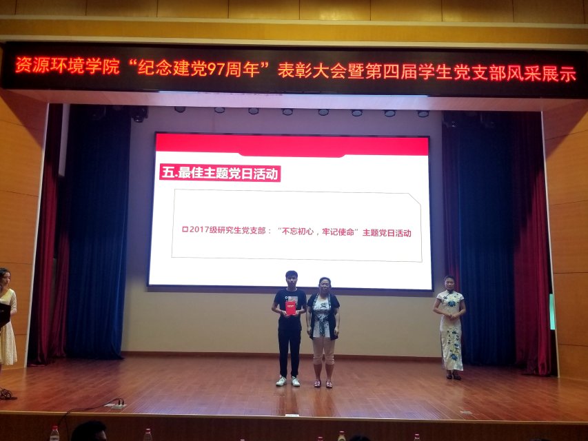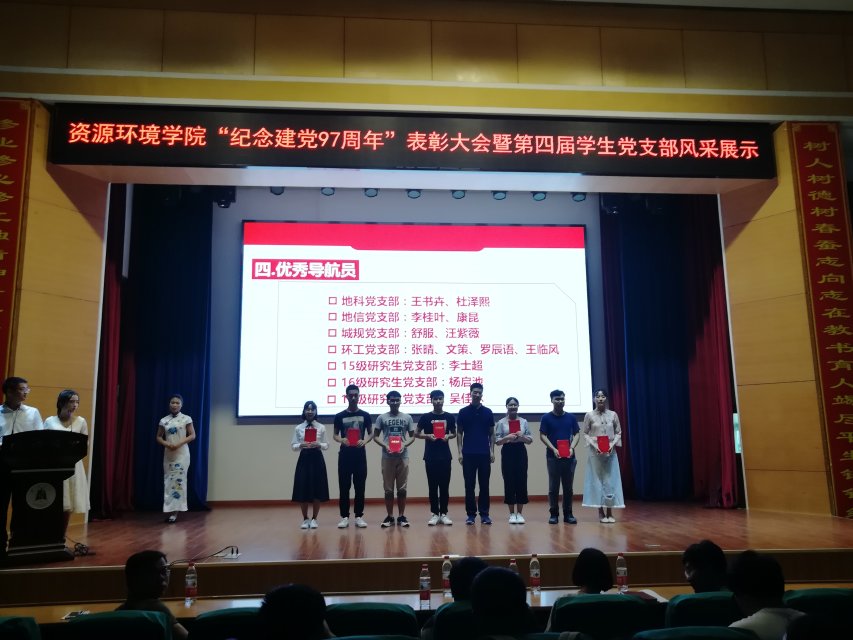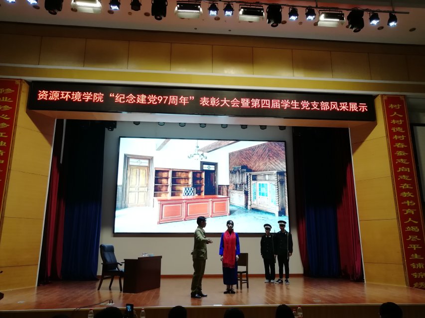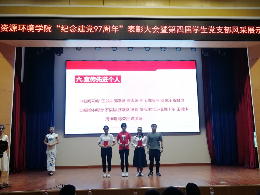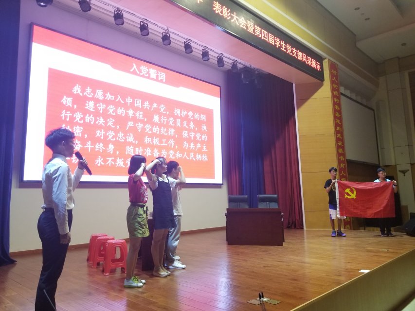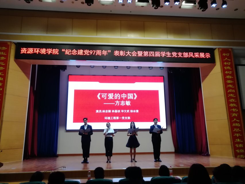 第四届学生党支部风采展示活动在阵阵掌声中拉开了帷幕,各个学生党支部纷纷用自己的形式表达了对党的热爱与崇敬。其中人文地理与城乡规划学生党支部通过重演经典红色话剧《红岩》,向同学们展现了共产党人对于信仰的忠贞和坚定;环境工程学生第一党支部的诗朗诵——《可爱的中国》,表达对于祖国母亲的满腔热忱。在风采展示的最后,地理信息科学学生党支部的康昆带领全体与会人员共同回顾了入党誓词。至此,2138cn太阳集团城庆祝建党97周年表彰大会暨第四届学生党支部风采展示大会圆满结束。