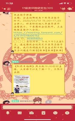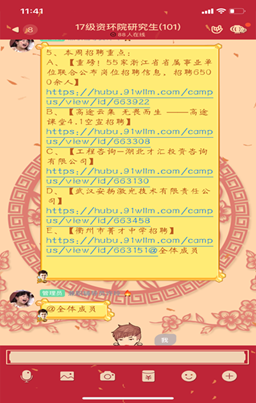 我院研究生会于2019年9月开始,利用群聊的便利性,配合院辅导老师在2017级资环研究生群在线上开展就业、创业活动,主要是为17级的准毕业生们提供相关就业、创业信息与指导,为即将迈向社会的准毕业生们顺利就业规避风险、保驾护航。